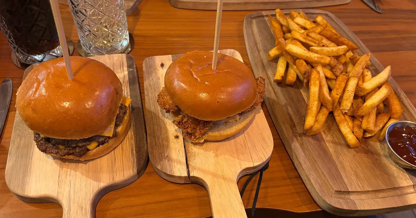 I ordered a starter of chicken tenders, a side order of fries and a smash burger, which came with bacon and cheese. I just looked online to ensure I got that right, but their website is listed as The Kinki, so now I don’t know what to believe. This feeling was exacerbated by receiving my chicken tenders as an additional burger rather than a starter.