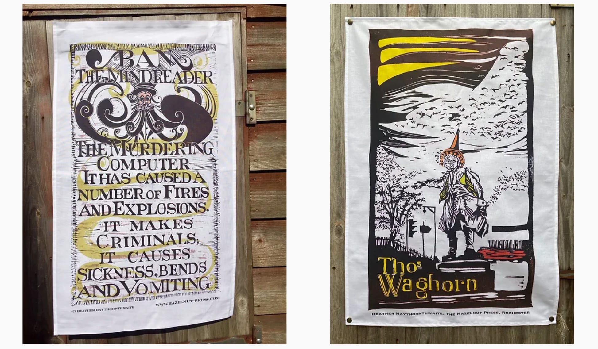The Hazelnut Press are fine printmakers in Rochester. They have produced these incredible Medway tea towels featuring our famous Thomas Waghorn cone statue, as well as the legendary Ban the Mindreader graffiti that used to adorn the wall of Medway Hospital.