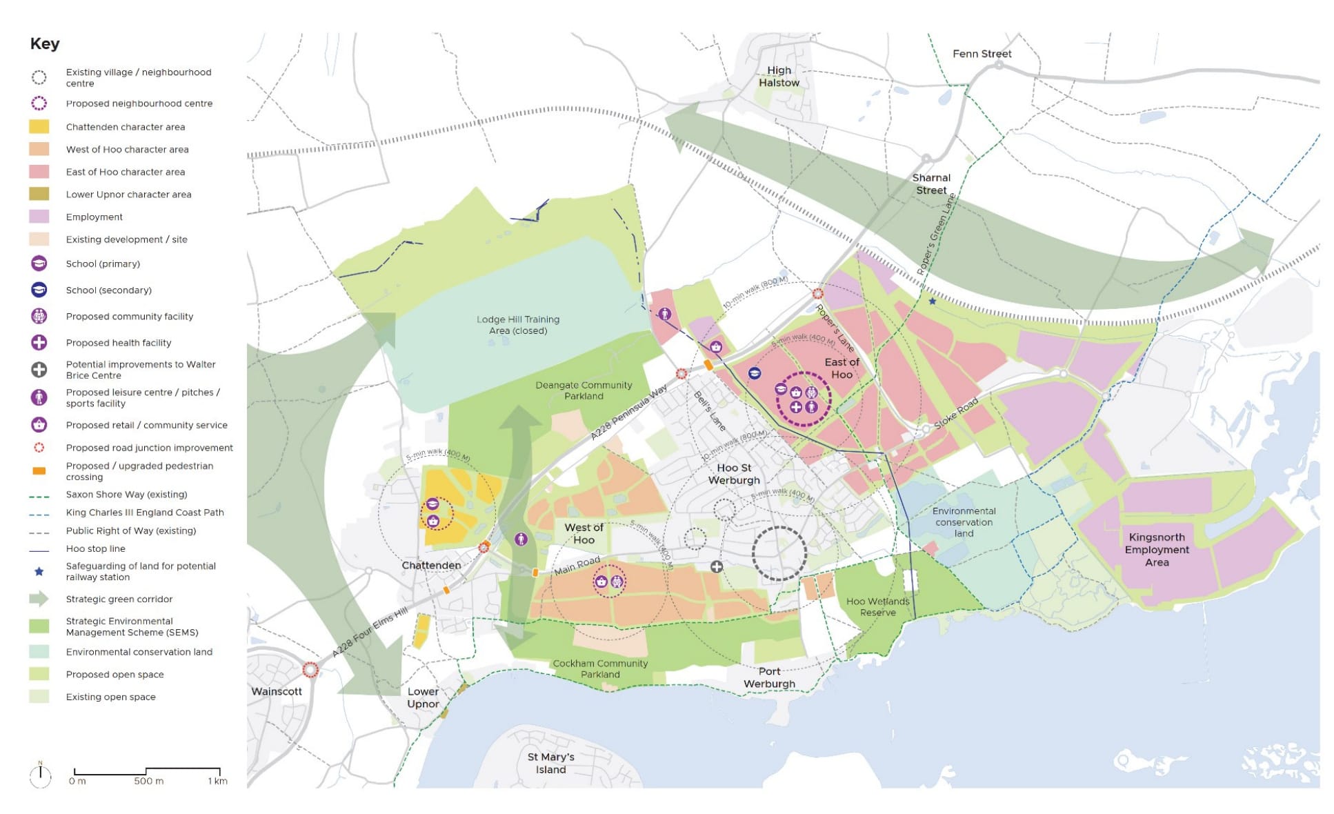Under this version of the Local Plan, Hoo St Werburgh would undergo a significant transformation, adding 5,300 new homes, increasing the size of the community by 50%. Plans for Hoo include a new town centre to the east of Hoo with retail, health, and education facilities and additional new local centres to the west and in Chattenden.