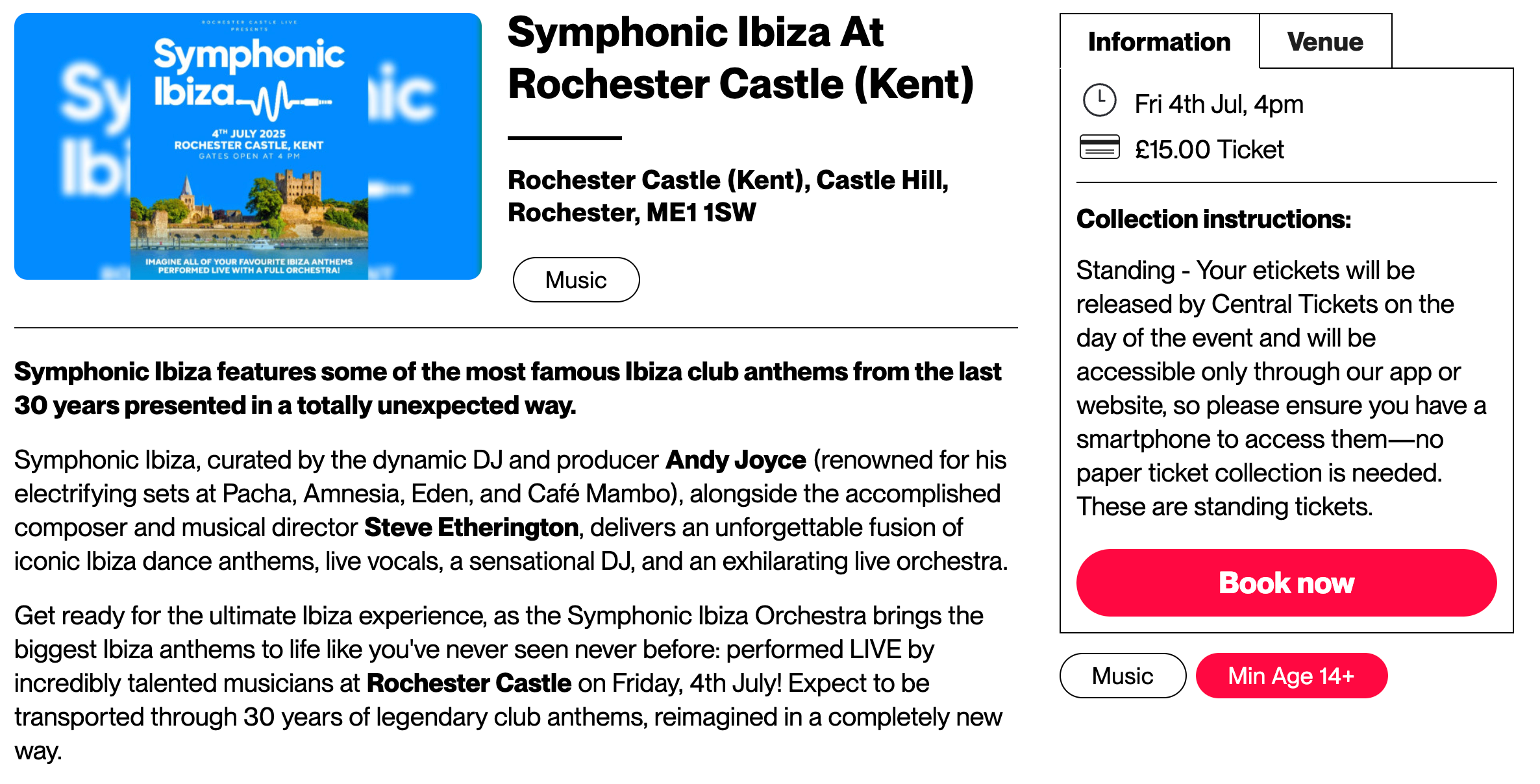 🎫 Tickets for one of this year’s Rochester Castle Live events are selling so sluggishly that they are being offered a substantial discount on a seatfiller website. The Symphonic Ibiza event on Friday 4 July is being offered for £15 on Central Tickets, while promoter The Festival Crowd continues to flog them for £35 to locals.