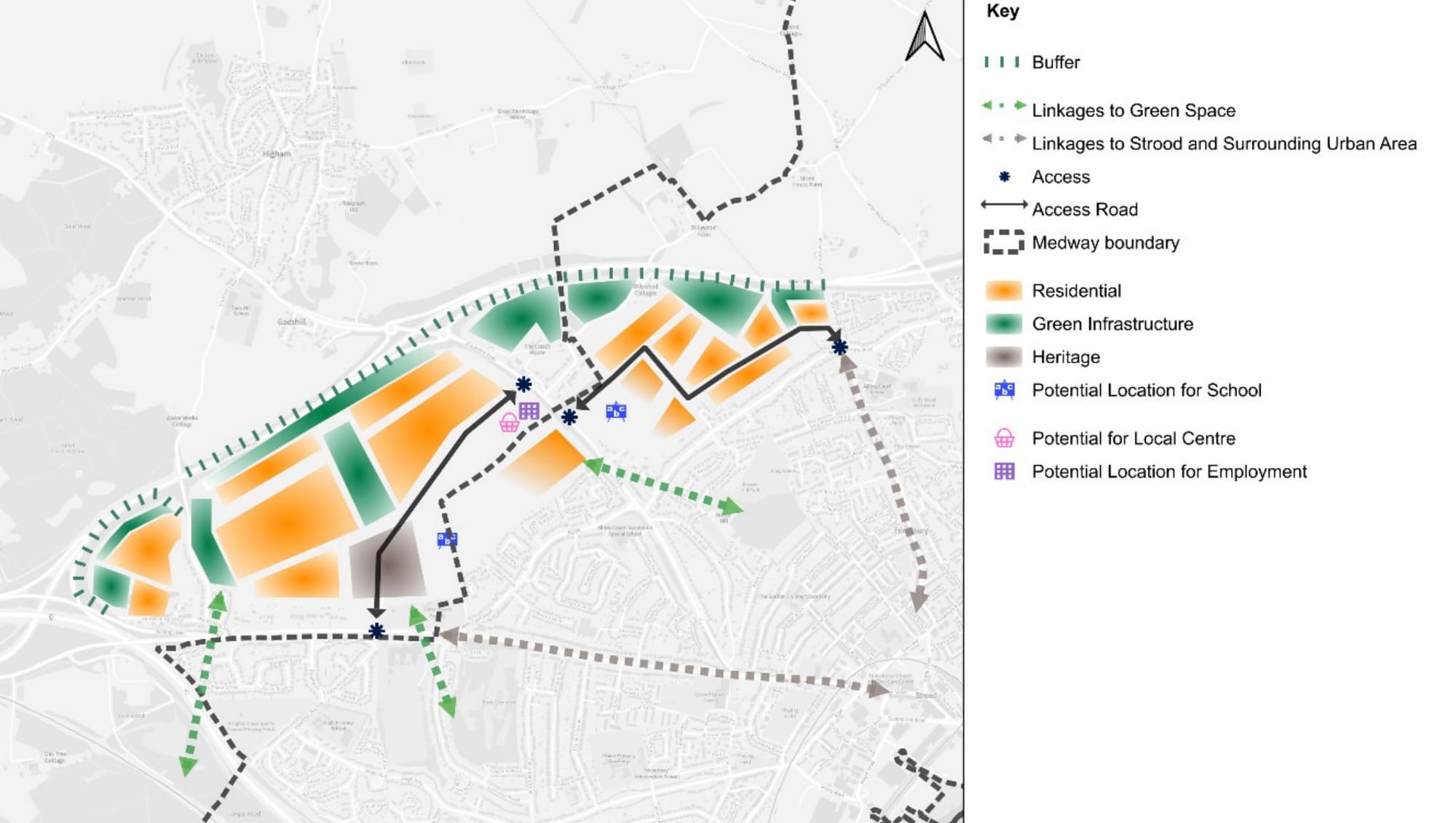 Perhaps the most surprising allocation in this plan is for land northwest of Strood, which was not included in the previous version. This includes sites for 1,200 new homes alongside a new local centre, employment space, and new schools on a greenfield land area on the border of Gravesham.