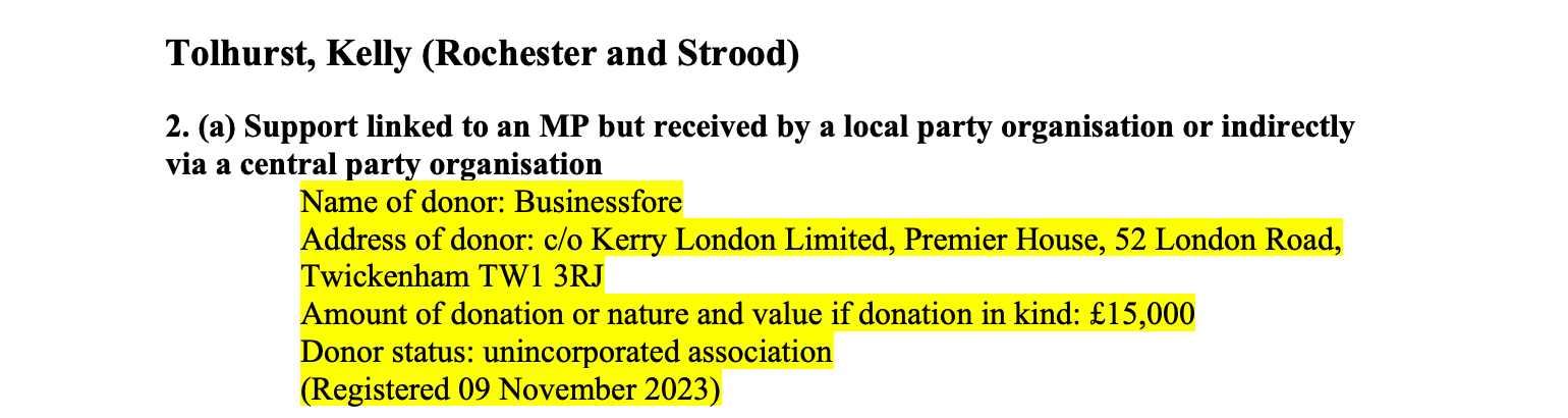 As ever, there is nothing to suggest that Kelly Tolhurst or Businessfore have done anything wrong. The issue once again is that an opaque organisation with no paper trail can donate significant sums to an MP with no public information about who they are or what their aims are.